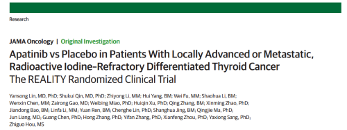 2021年12月16日,权威医学杂志《JAMA Oncology》(影响因子31.777)在线发表阿帕替尼的一项III期临床研究(REALITY)——甲磺酸阿帕替尼片治疗局部进展/转移性放射性碘难治性分化型甲状腺癌(RAIR-DTC)患者的多中心、随机、双盲、安慰剂对照临床研究。此研究由北京协和医院的林岩松教授和南京金陵医院的秦叔逵教授发起,在全国21个研究中心展开,由AG百家乐官网医药中央医学事务部团队支持完成。