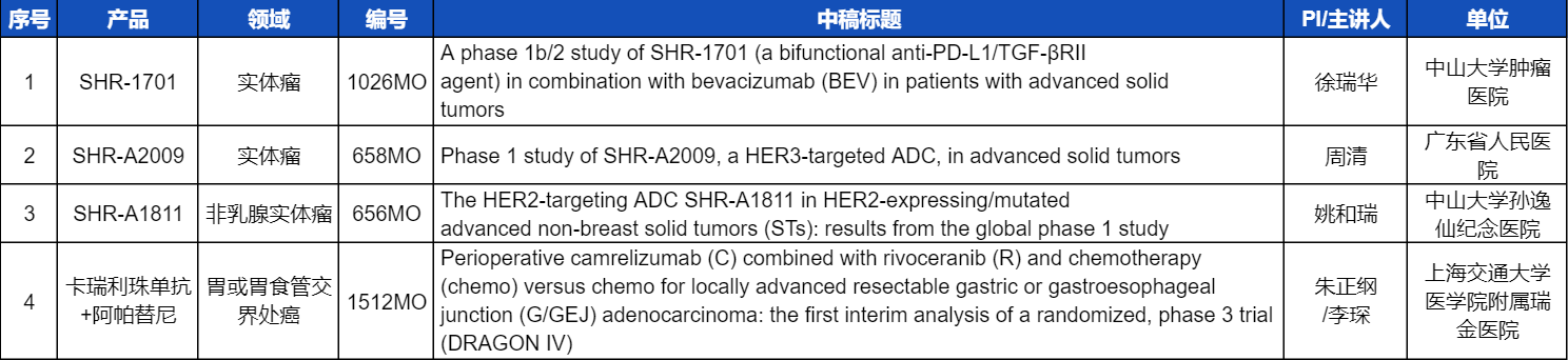 本次ESMO大会,将由中山大学肿瘤医院徐瑞华教授、广东省人民医院周清教授、中山大学孙逸仙纪念医院姚和瑞教授、上海交通大学医学院附属瑞金医院李琛教授分别就4项AG百家乐官网医药创新产品相关研究做口头报告,包括SHR-1701、SHR-A2009、SHR-A1811这3款未上市创新产品的实体瘤治疗临床研究,以及1项“双艾”组合(卡瑞利珠单抗联合阿帕替尼)治疗局部晚期可切除胃/胃食管交界处癌的Ⅲ期临床试验期中分析。