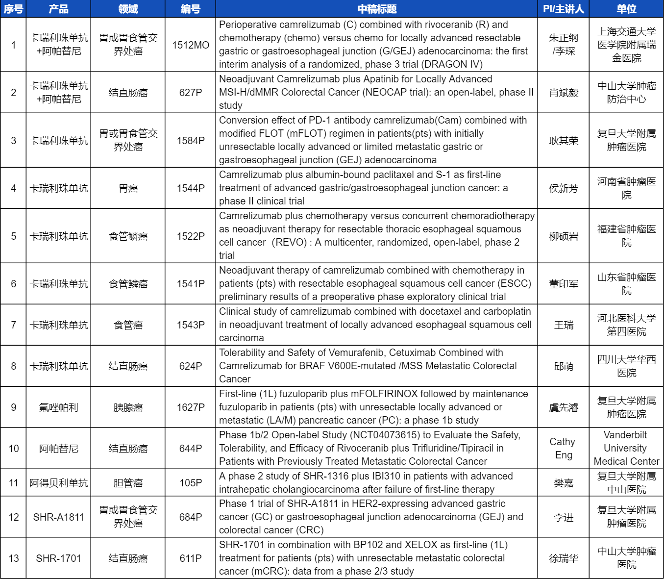 在消化系统肿瘤领域,AG百家乐官网创新产品相关研究共入选1项口头报告和12项壁报展示。除了经典的明星药物卡瑞利珠单抗和阿帕替尼,SHR-A1811、SHR-1701等未上市创新产品也有相应研究入选。此外,阿得贝利单抗、氟唑帕利等已上市药物也在积极探索新的适应症,本次ESMO大会分别有肝内胆管癌和胰腺癌相关研究入选。这些新老药物前沿研究的不断出现,有望为消化系统肿瘤患者带来新的福音!
