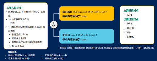 达尔西利(Dalpiciclib)是AG百家乐官网医药自主研发的口服、选择性的小分子CDK4/6抑制剂,也是中国首个自主研发的新型高选择性 CDK4/6 抑制剂,已证实其与内分泌治疗(ET)联合用于 HR+/HER2- 晚期乳腺癌的一线和后线治疗时,均显著改善无进展生存期(PFS)6,7。因此开展了一项随机、双盲、III期临床试验(DAWNA-A),以进一步评估达尔西利联合内分泌治疗作为高危早期 HR+/HER2 - 乳腺癌辅助治疗的效果。本研究纳入高危复发风险人群需满足以下标准之一:①≥4 枚阳性腋窝淋巴结;②1–3枚阳性腋窝淋巴结且合并≥1 项高危因素(肿瘤直径 ≥5 cm,组织学分级3级,辅助治疗后残留浸润性乳腺癌,Ki-67 ≥30%)。本文呈现预先设定的首次中期分析(IA1)结果。